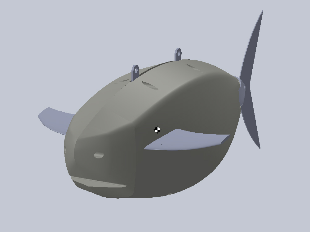 The 3D model of the robotic fish. The fish had 2 control surfaces for locomotion - tail fin (vertical surface, controls yaw and speed), front fin (horizontal surface, controls pitch and elevation).